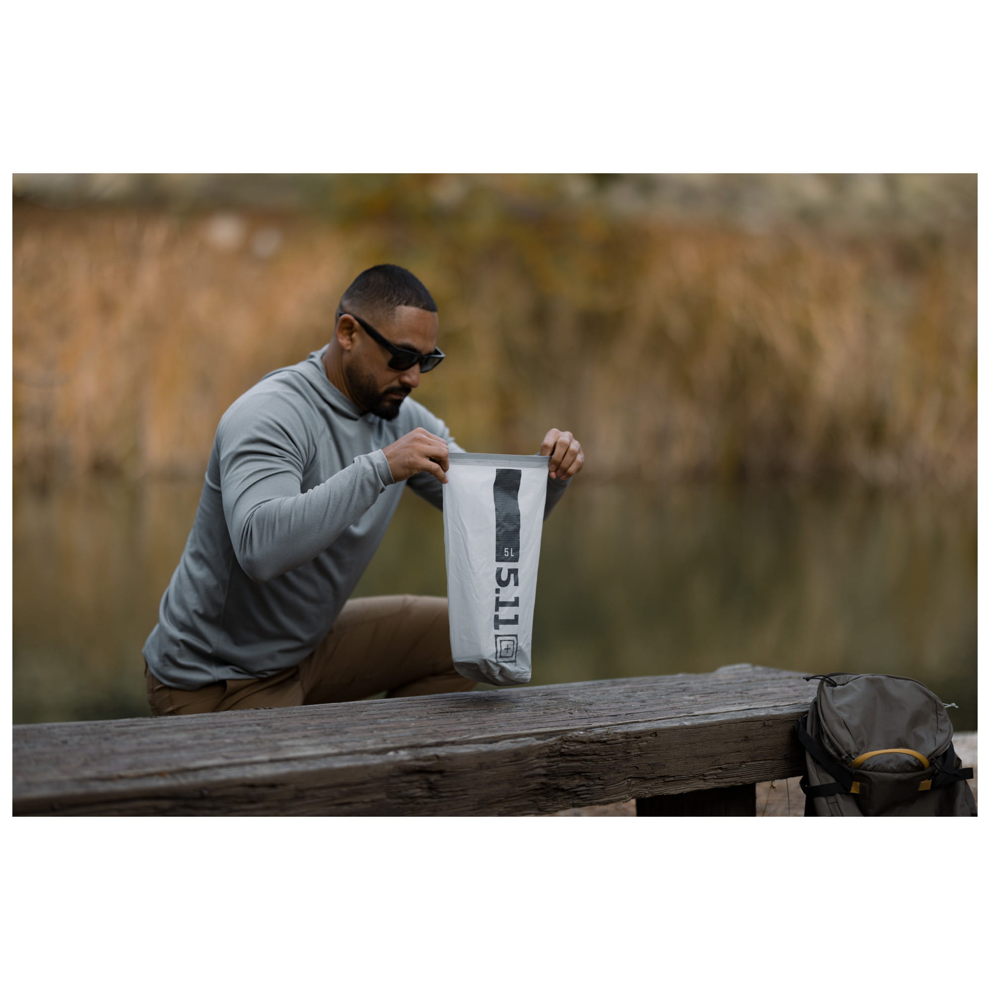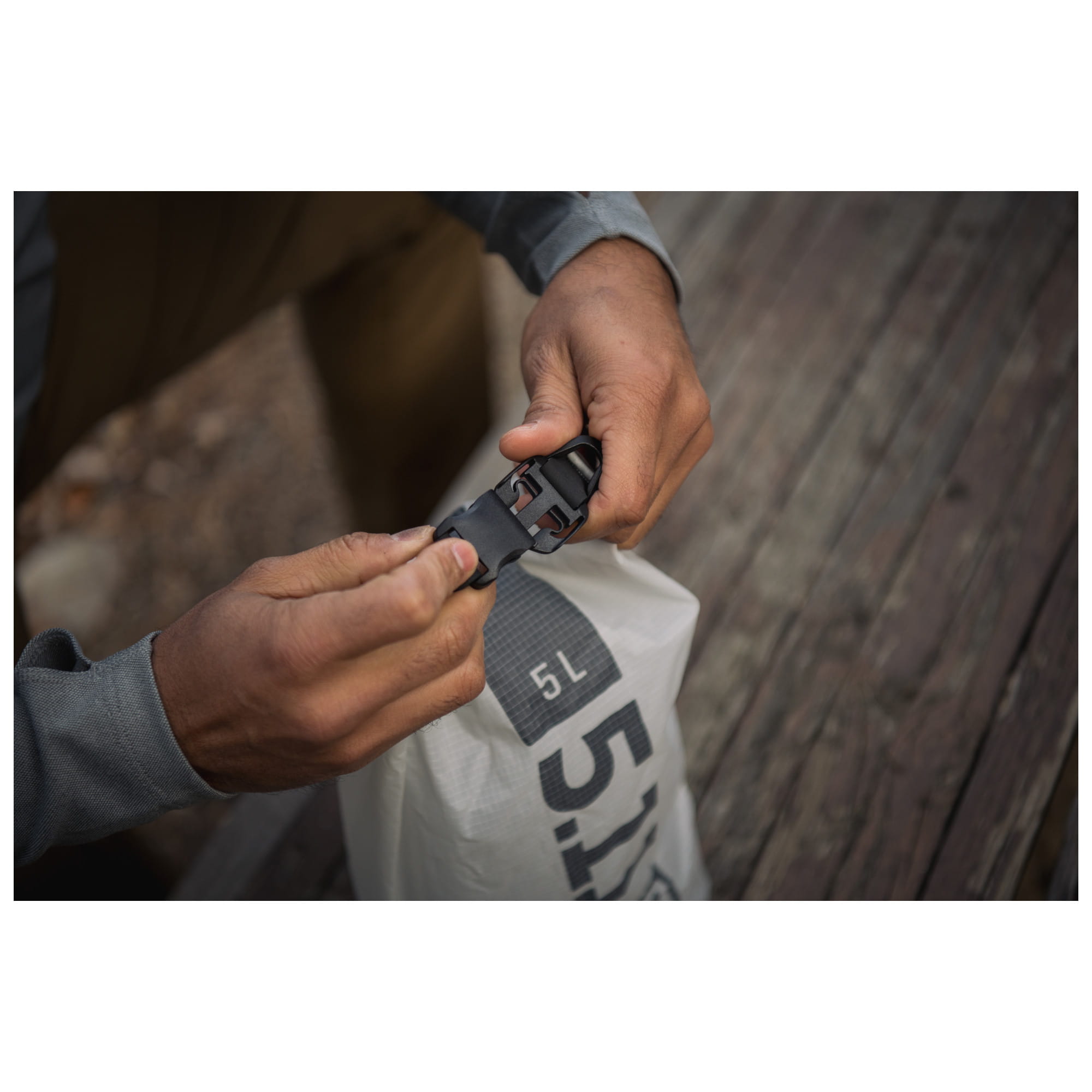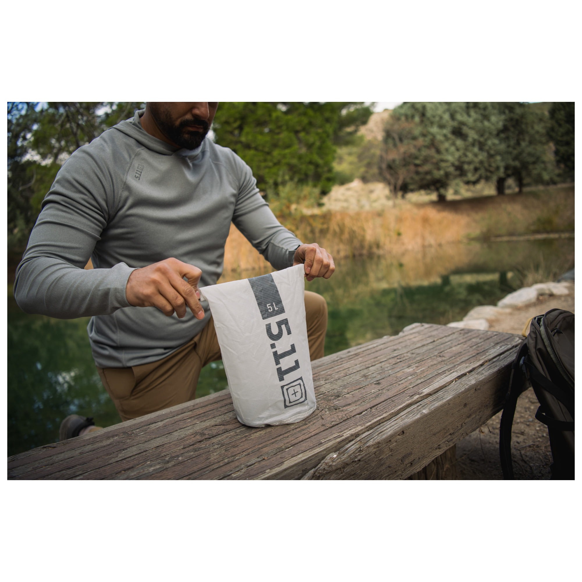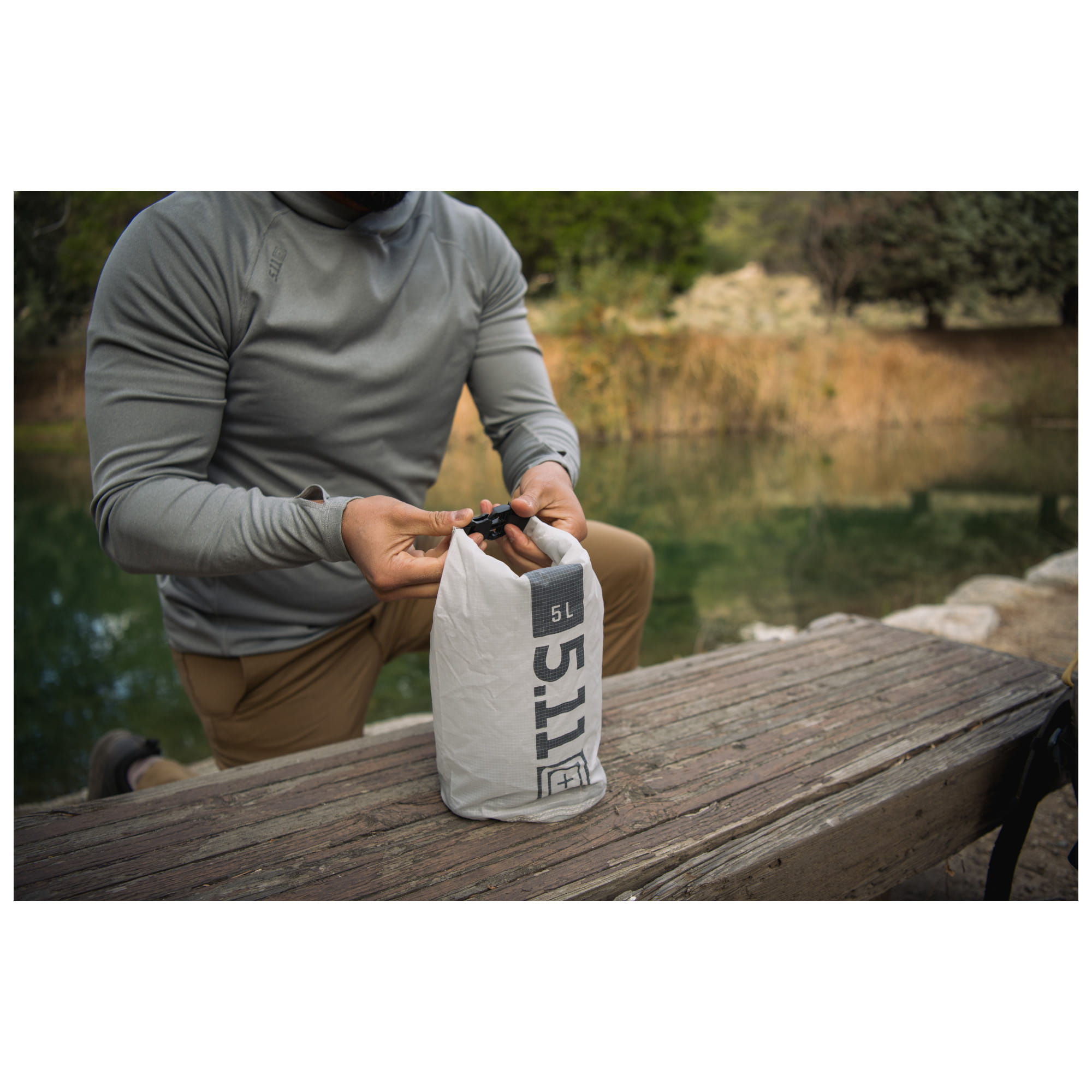 Ultralight Dry Bag to 5 litrowy worek firmy 5.11, który ma za zadanie chronić akcesoria przed wodą. Stopień ochrony wynosi 2K co oznacza że jest odporny na deszcz, zachlapania oraz krótkie zanurzenia. Do uzyskania takiej stopnia 2K, firma wykorzystała Nylon o gęstości 40 denierów, pokrywając go dodatkowo silikonową powłoką. Górne zapięcie składa się z dość sztywnego paska, oraz polimerowej klamry szybkiego wypięcia. Jest to świetne rozwiązanie ponieważ pasek maksymalnie ułatwia równomierne i szybkie zrolowanie, a na samym końcu wystarczy spiąć klamrę która zapobiega rozwinięciu.